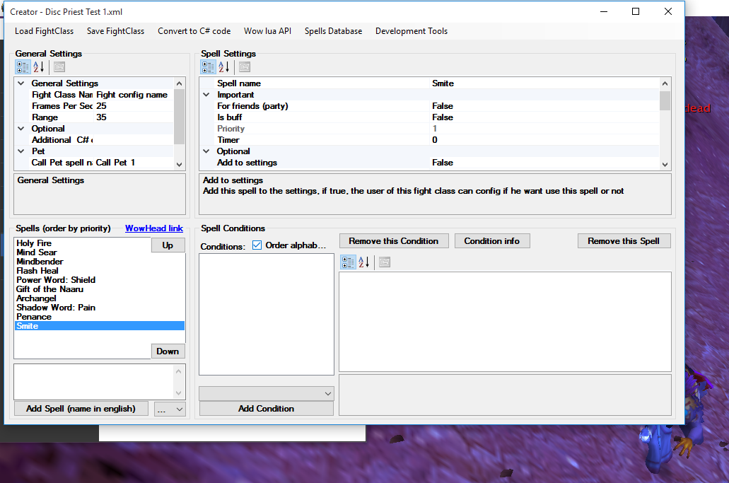 Okay so basic disc priest, if you want to add spells open in Tools > create fight class and add spell name with Correct spelling, this includes Capitals. Then from top being the last priority spell to bottom being first, assign it to the spot you want it, then you can add spell conditions if you please.